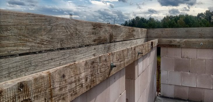Budowa domu systemem gospodarczym. Skręcanie belek wieńca na ścianie kolankowej.